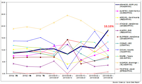 보령제약은 지난해 9월 멕시코에서 출시된 '카나브(멕시코 제품명 아라코)'가 발매 1년 만인 지난 8월 순환기내과 ARB계열 단일제부문 주간 처방율 1위에 오르며, 빠르게 시장에 진입하고 있다고 밝혔다. 멕시코 사보험 시장(Private market) IMS data에 따르면, 카나브는 지난 8월 마지막 주(8월 29일~9월 4일)에 주간 처방률 18.8%로 1위에 오른 것으로 나타났다.