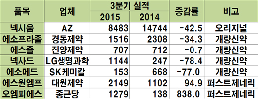 결국 넥시움은 제네릭 진입과 약가인하라는 파고를 넘지 못하고 올 3분기 84억 원대 성적을 기록하며 2014년 대비 42% 처방실적이 감소했다.