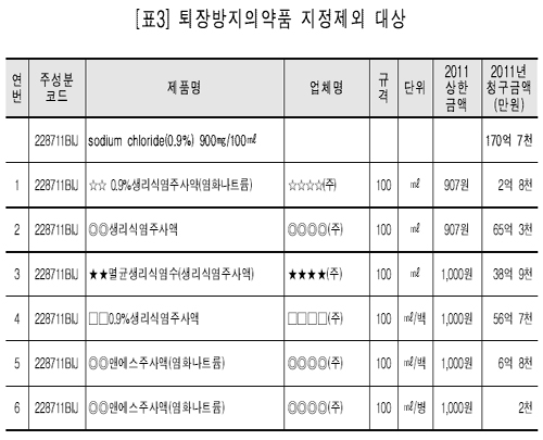 이에 대해 복지부는 멸균생리식염수의 2014년도 청구금액이 60억4000만원 수준인 등 4개 제품의 청구금액이 퇴방약 제외기준과 비교할 때 상대적으로 크다고 지적했다.