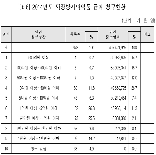 이어 2014년도 퇴방약 678개 품목 중 연간 청구금액이 50억원 이상인 품목이 13개(1.9%)에 달하고, 33개 품목(4.9%)은 청구가 전혀 없는 등 퇴방약 지정·관리가 당초 취지에 부합하지 않는 실정이라고 했다.
