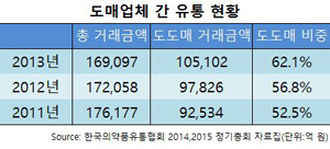 의약품 총 거래금액과 함께 도도매 거래액이 증가했다. 도도매 거래 비중은 2011년 52.5%, 2012년 56.8%, 2013년 62.1%로 크게 증가하고 있다. 2년 사이 10%가 증가한 것으로 나타났다.