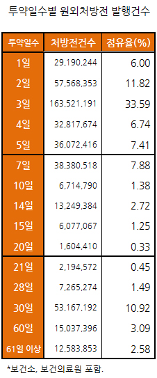 7일분 처방은 7.88% 비중인 3838만518건으로 전년대비 2.38% 늘었고, 4일분 처방은 6.74% 비중인 3281만7674건 발행돼 1.21% 증가했다.