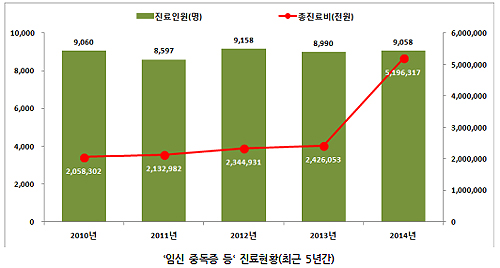 심사평가원이 오는 10일 '임산부의 날'을 맞아 2010년부터 지난해까지 최근 5년 간 이 질환 건강보험과 의료급여 심사결정자료를 분석한 결과 이 같은 동향이 나타났다.