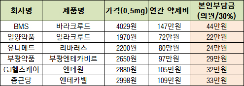 본인부담금이 30%인 의원에서 처방받아 매일 한알씩 복용한다고 가정하면 오리지널 바라크루드는 1년 약 44만원의 약값이 소요된다. 하지만 제네릭약물은 21만원에서 32만원으로 10~20만원을 절약할 수 있다.