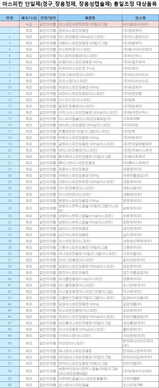 통일조정 대상품목은 국내사들이 제조중인 아스피린 제제 56품목이이다.