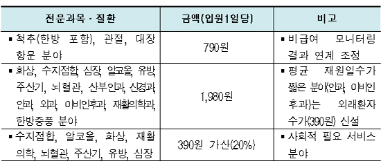 또 전문병원을 통한 대형병원 환자쏠림 완화, 양질의 의료서비스 제공 등을 위해 전문병원 관리료가 신설된다. 연간 금액은 70억원 규모이며, 비급여 등 지정 분야별 특성을 감안 차등 지원된다.