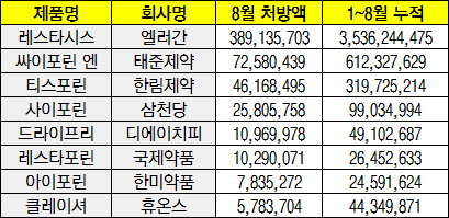 오리지널 레스타시스는 올초 종근당과 판매협약을 맺고 점유율 하락에 대비하고 있지만 제네릭 진입에 따른 약가인하 영향은 피해가지 못하는 모양새다. 8월 처방액은 3억8913만원까지 떨어졌다.