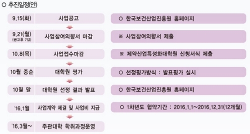 지원대상은 2016년 1학기 중 제약산업 학위과정을 설치해 신입생 선발이 가능한 고등교육법에 의거해 설립된 대학이다.