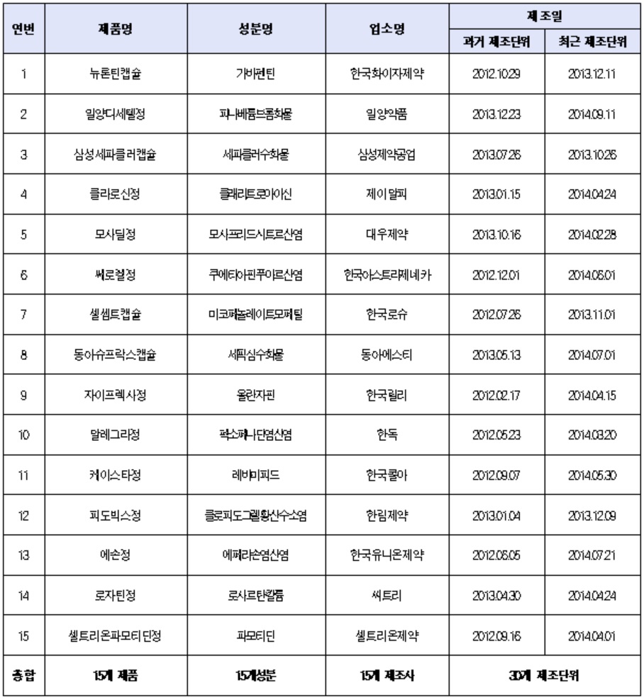 식약처는 제조소, 제조방법, 원료조성이 자주 변경돼 품질 변경 가능성이 상대적으로 높은 15개 품목을 선정했다. 품목 별로 제조단위가 다른 2개씩을 수거했고, 총 대상은 30개 제품이었다.