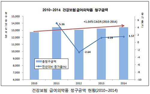 2012년에는 약가 일괄인하 등의 영향으로 2.64% 감소했지만 2013년과 2014년에는 각각 1.28%, 1.57%씩 증가했다. 이 중 지난해는 2010년보다 약 5.3% 증가한 13조4491억원으로 집계됐다.