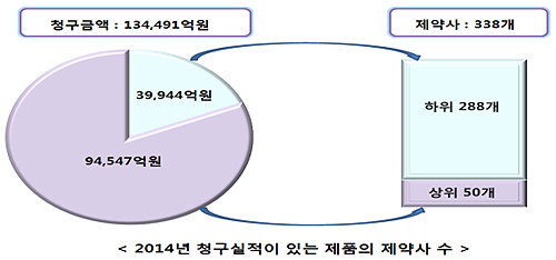 청구실적이 있는 338개 제약사 중 14.8%에 해당하는 상위 50사가 전체 금액의 70.3%를 차지하는 등 상위기업 집중도가 매우 높은 과점적 시장 특성이 여전했다.