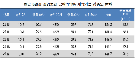 전체 보험약 청구액 13조4491억원 가운데 9조4547억원 규모를 과점한 것인데, 최근 5년 간 추이를 볼 때 다소 완화된 상황이지만, 업체 간 경쟁은 계속 심화되고 있다.