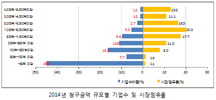청구규모별 기업분포와 점유율 변동을 살펴보면, 지난해 청구금액 기준이 2000억원 이상인 소수 상위 5.1%(17개)의 기업이 시장점유율 40.6%를 차지한 반면, 청구금액이 50억원 미만인 영세기업은 152개로 45.0%를 차지했다. 기업의 총 청구금액은 전체의 1.1%에 불과한 양극화 쏠림현상을 보이고 있다.