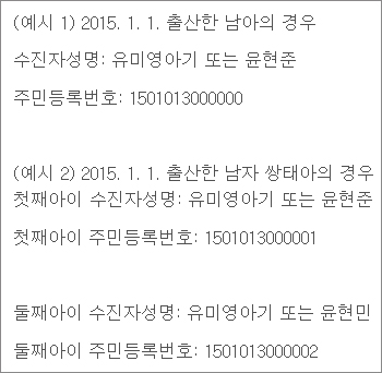 다만 쌍둥이(쌍태아)의 경우 주민등록번호 끝자리에 첫째는 '1'을, 둘째는 '2'를 기재하는 방법으로 구분해 청구한다.