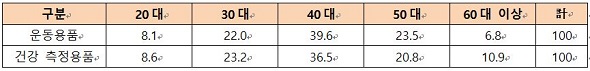 또 노년층의 필수품으로 여겨지던 건강 측정용품(체성분계,혈압계,만보기 등)에서 30대의 매출 비중이 50대보다 높게 나타난 것도 눈에 띈다.