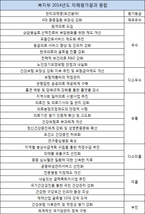 보건복지부가 최근 국회에 제출한 '2014년도 자체평가 결과보고서(주요정책부문)' 내용이다. 이번 평가는 주요정책과제 총 77개(보건의료 36, 사회복지 21, 인구 20)를 대상으로 '정책형성', '정책집행', '정책성과' 등으로 구분해 진행됐다.
