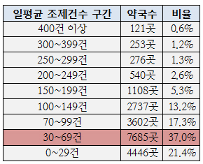 구간별로 보면 0~29건을 조제하는 약국은 4446곳(21.4%), 약국 7685곳(37%)은 30~69건 조제 구간에 집중됐다.