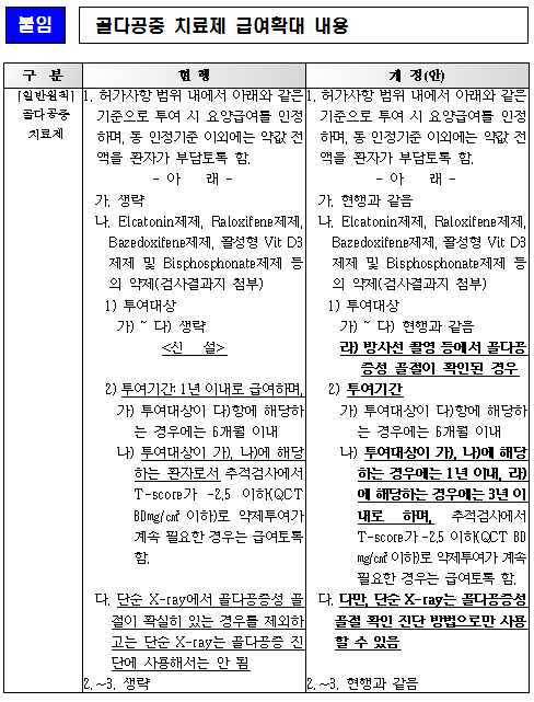 이에 따라 복지부는 전문가 검토를 거쳐 골다공증성 골절에 대해서는 골밀도 검사 수치와 관계없이 3년 이내에서 비호르몬 요법제를 투약할 수 있도록 보험급여 확대안을 마련했다.