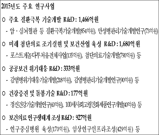 실제 복지부 R&D 예산은 2011년 3371억원에서 2015년 5117억원으로 11% 증가했다. 내년 예산은 6000억원을 신청할 계획이다.