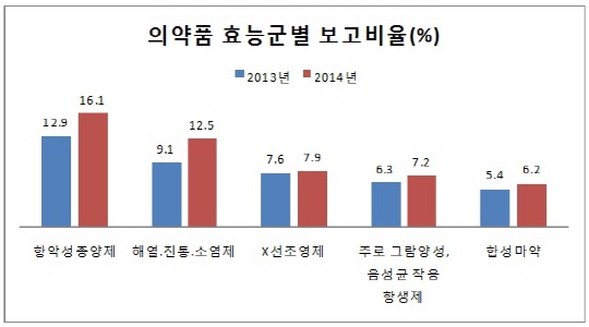 보고된 부작용을 효능군 별로 분류해보면, 항악성종양제가 2만9577건(16.1%)으로 가장 많았고, 해열진통소염제 2만2912건(12.5%), X선 조영제 1만4572(7.9%), 항생제 1만3286건(7.2%), 합성마약 1만1365건(6.2%) 등의 순이었다.