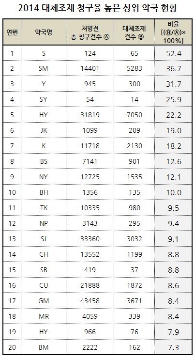 또 SM약국 36.7%(5283건), Y약국 31.7%(300건), SY약국 26.9%(14건), HY약국 22.2%(7050건) 등 상위 5위권 안에 든 약국들은 20%대 이상의 대체조제율을 기록한 것으로 나타났다.