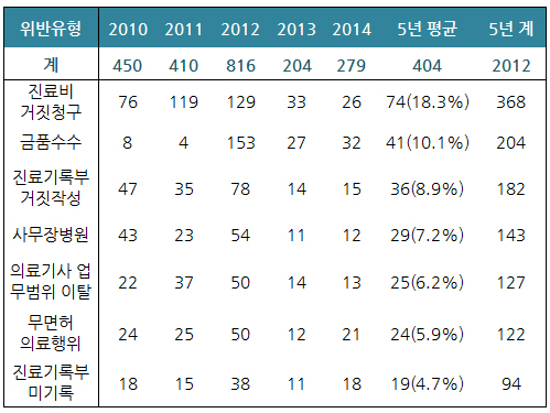 이어 면허범위와 관련된 행정처분 13%, 의료기관 개설 관련 10%, 진단서 관련 6%, 환자 유인행위 4% 등으로 뒤를 이었다.