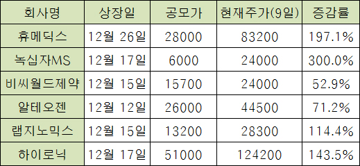 데일리팜이 10일 지난해 12월 신규 상장한 6곳의 제약-바이오 관련사들의 주가 흐름을 살펴본 결과 이들 기업 주가는 평균 2배 이상 급등했다.