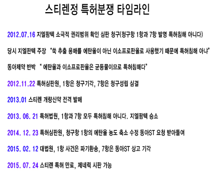 이날 대법원이 판결한 스티렌 특허관련 사건은 2개입니다. 2개 모두 스티렌 판매사인 동아ST가 개량신약 개발사인 지엘팜텍을 상대로 상고한 사건입니다.