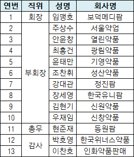 감사에는 이번 선거에 중도 사퇴한 박호영 한국위너스약품 대표, 이찬호 인화약품판매 대표가 이름을 올렸다.