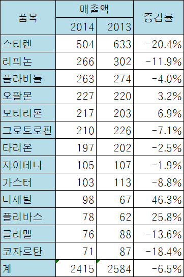 데일리팜이 6일 동아ST 2014년 주요 전문의약품 실적을 분석한 결과 상위 13개 품목 중 9품목이 전년대비 실적이 감소한 것으로 조사됐다.