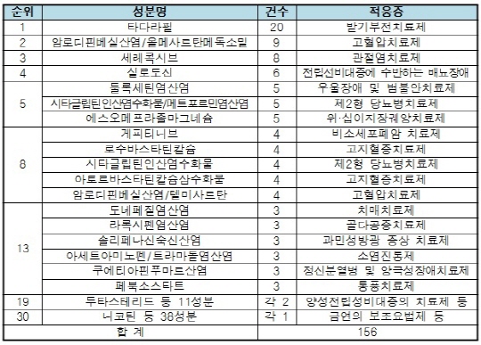 성분별로 타다라필이 20건으로 가장 많았고, 암로디핀베실산염/올메사르탄메독소밀이 9건, 세레콕시브 8건, 실로도신 6건 등으로 뒤를 이었다.