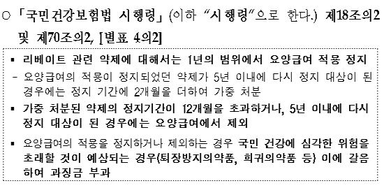 다만, 7월2일 이후 위반기간이 전체 위반기간에 비해 짧아서 급여제한을 적용하는 게 '현저히 불합리하다'고 판단되는 때는 시행일을 기준으로 이전 위반에 대해서는 약가인하, 이후 위반에 대해서는 급여정지 처분할 수 있도록 예외를 뒀다.