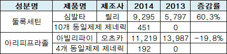 2014년 유비스트 자료를 토대로 심발타 제네릭과 아빌리파이 제네릭의 연간 원외처방액을 살펴본 결과, 심발타 제네릭은 10개 제품이 총 4억5100만원, 아빌리파이 제네릭은 4개 제품이 1억9200만원에 그쳤다.