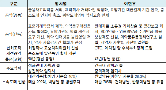 ◆공약비교=두 후보가 내세운 공약은 사실 큰 차이가 없다. 불용재고의약품 처리, 제약회사 거래마진 적정화, 요양기관 대금결제 기간 단축, 중소도매 연회비 축소 등에서 비슷한 의견을 내고 있다.