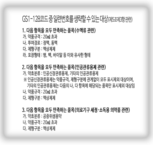 개정 내용을 살펴보면 이번에 일련번호 표기 및 바코드 부착이 '생략'된, 즉 유예된 품목은 크게 수액제, 인공관류용제, 의료기구 세정·소독용약으로 구분된다. 공통적으로 약품 용량과 규격은 생산라인을 감안해 20ml 초과 품목으로 통일됐다.