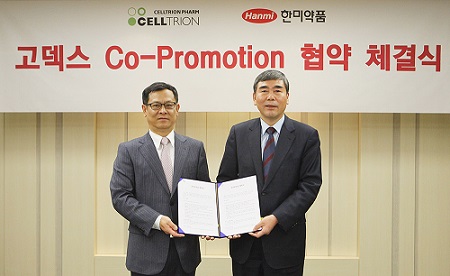 셀트리온제약(사장 김만훈)과 한미약품(대표이사 이관순)은 지난 8일 서울 송파구 한미약품 본사에서 고덱스 코프로모션 계약을 체결했다고 9일 밝혔다.