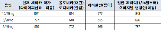 이는 현재 세비카 보험가격보다 5/20mg이 12%, 5/40m이 27% , 10/40mg도 27% 낮다.