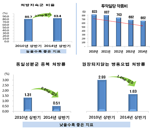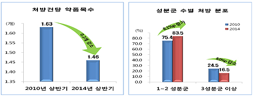 처방건당 약품목수는 1.46개로 최초평가 대비 0.2개 감소했고, 심·뇌혈관 질환 등 합병증이 없는 환자에게 처방한 성분군수는, 1~2성분군은 증가한 반면, 3성분군 이상 처방한 비율은 16.5%로 최초평가 시점보다 8.0%p나 감소했다.