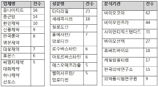 신풍제약 9건, 한국콜마·명문제약 각각 8건, 대웅제약 7건 순이었다.