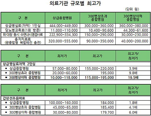 규모별로 상급종병은 최저 5만5000원(충남대병원)에서 최고 32만원(화순전남대병원 10만5000원~32만원)으로 5.8배, 300병상 초과 종병은 최저 2만5000원(안동병원 2만5000원~4만원)에서 최고 20만원(성빈센트병원(8만~20만원) 외 2기관)으로 8배, 300병상 이하 종병은 최저 2만원(인화재단 한국병원 2만~6만원), 최고 23만원(남양주 우리병원 3만~23만원)으로 11.5배 차이가 나는 것으로 확인됐다.