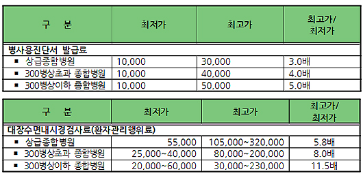 대장수면내시경검사료(환자관리행위료)의 경우 최저 2만원에서 최고 32만원으로 최저-최고비용 격차가 16배로 벌어졌다.