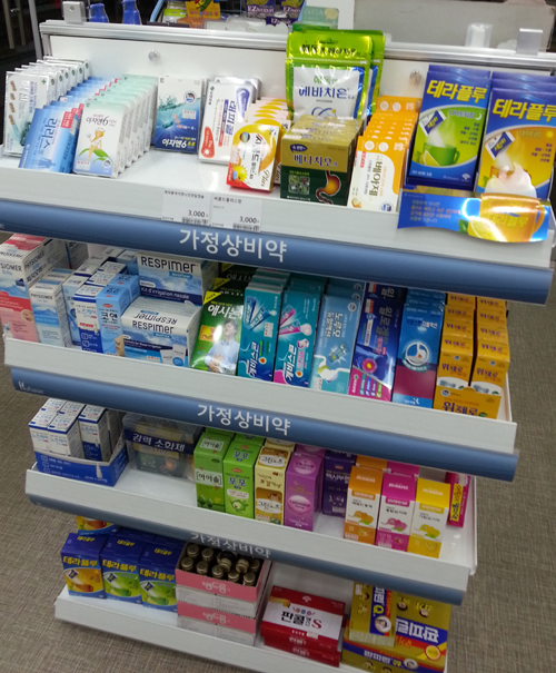 경기도 부천의 또 다른 약국도 최근 개비스콘과 스트렙실, 테라플루, 판콜과 판피린 등을 비롯해 비교적 가격대가 높은 인사돌, 아로나민, 우루사 등 지명구매가 빈번한 일반약 제품들을 별도 셀프매대 진열장에 배치했다.