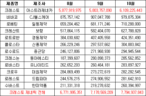 크레스토 제네릭은 출시 이후 꾸준히 성장곡선을 그리며 월 처방 10억원을 바라보는 제품도 나오고 있다.