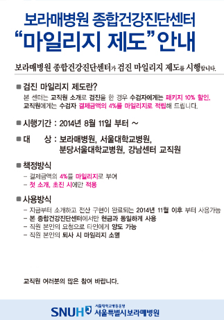 검진 마일리지 제도는 교직원 소개로 검진을 받은 수검자는 '패키지 10% 할인' 혜택을 제공하고, 소개한 교직원에게는 수검자 결제금액의 4%를 마일리지로 적립해 주는 방식으로 운영된다.