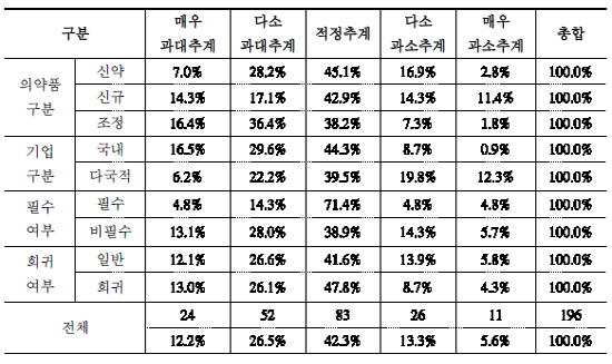 기업구분에서는 다국적제약사의 적정추계 비율이 39.5%로 국내사 44.3%보다 더 낮았다. 다국적제약사는 다소 과대추계 22.2%, 다소 과소추계 19.8%로 적거나 많게 추계하는 비율이 고루게 분포했다.