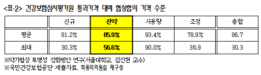최 의원은 "국민들은 건보료를 더 내면서 재정적자를 막고 있는 데 복지부는 재정절감보다 제약사 배불리기에 앞장서고 있다"면서, '대체약제 가중평균가 수용 신약' 등재 간소화 방안을 문제 삼고 나섰다.
