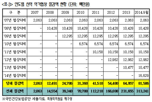 실제 건보공단 추계자료를 보면 약가협상을 통해 그동안 절감된 금액은 총 3132억원(누적)에 달한다고 최 의원은 설명했다. 약가협상을 하지 않으면 고스란히 국민들이 부담해야 할 금액이라는 것이다.
