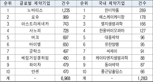 상위 10개 글로벌 제약기업은 6968건, 상위 10개 국내 제약기업은 1283건의 특허출원건수를 기록했다.