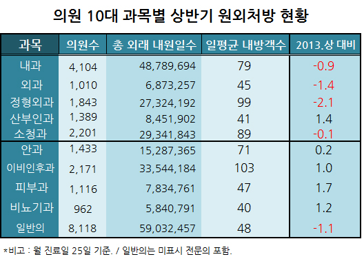 정형외과는 하루 평균 99명의 환자가 진료받아 지난해보다 2.1% 가량 떨어졌고, 외과도 45명으로 1.4% 줄어들었다.
