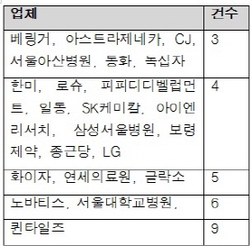 또 한미약품·일동제약·로슈·SK케미칼·보령제약·종근당·LG생명과학 등은 각 4건, 베링게인겔하임·아스트라제네카·CJ헬스케어·동화약품·녹십자 등은 각 3건을 기록했다.